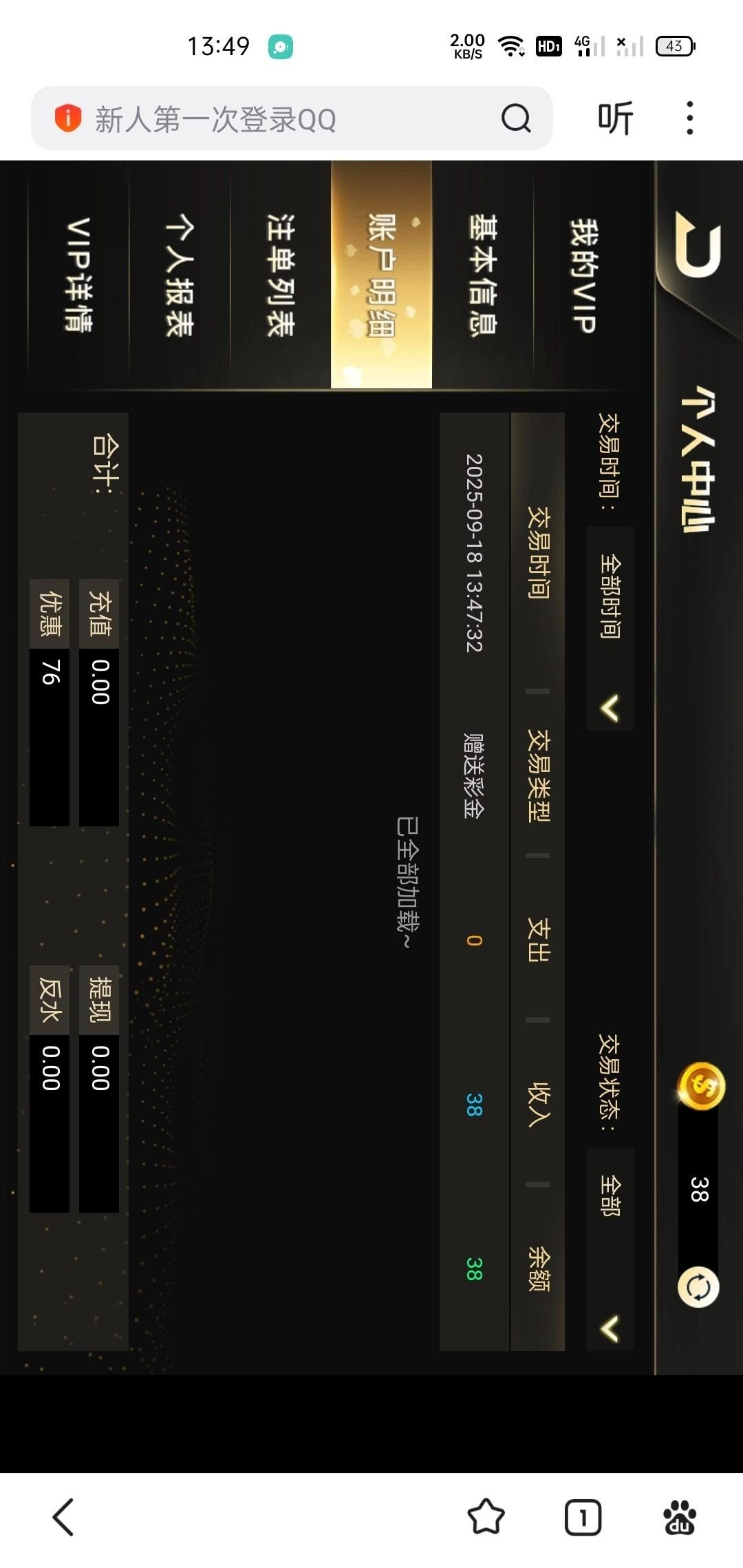接到电话登录上去显示手机号注册过了,我记得好像以前领过一次38了也没充值过,然后登录上去找在线客服又送了38,没有游戏限制三倍流水